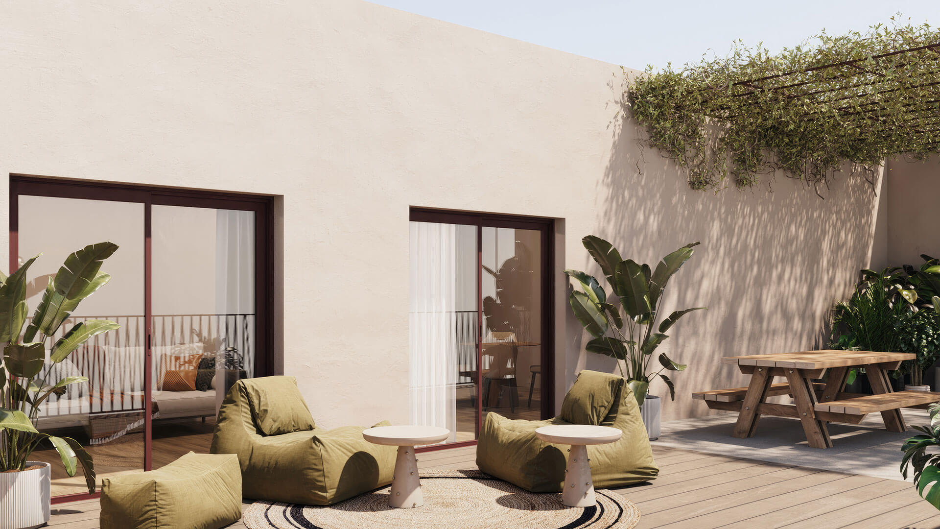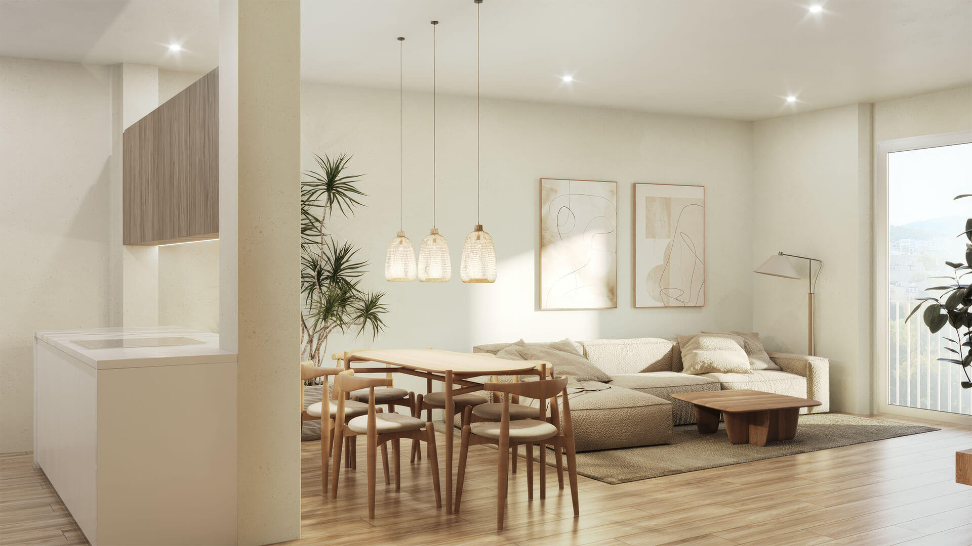 Els renders que s'han confeccionat són fins merament comercials i en cap cas no són documents contractuals. Aquests poden patir variacions al llarg del desenvolupament del projecte immobiliari o contenir elements que no coincideixin exactament o íntegrament amb la imatge mostrada. Per rebre informació completa, poseu-vos en contacte a través del formulari indicat, email o telèfon de contacte